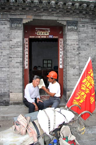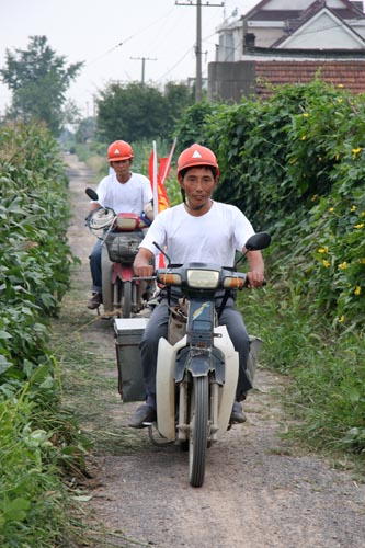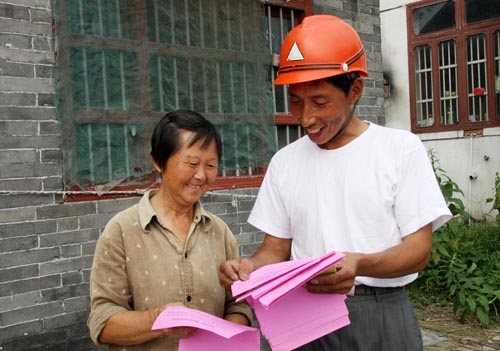 朱福华在农村向用户发送服务承诺和相关知识材料。